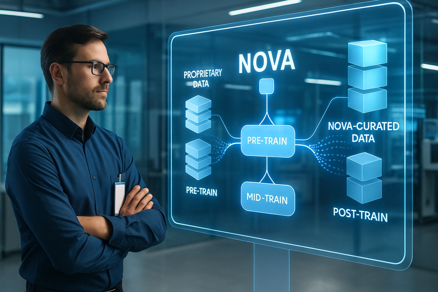 A researcher reviews the Nova Forge training pipeline, where proprietary datasets blend with Nova-curated data to build customized frontier-scale models on AWS. Image Source: ChatGPT-5