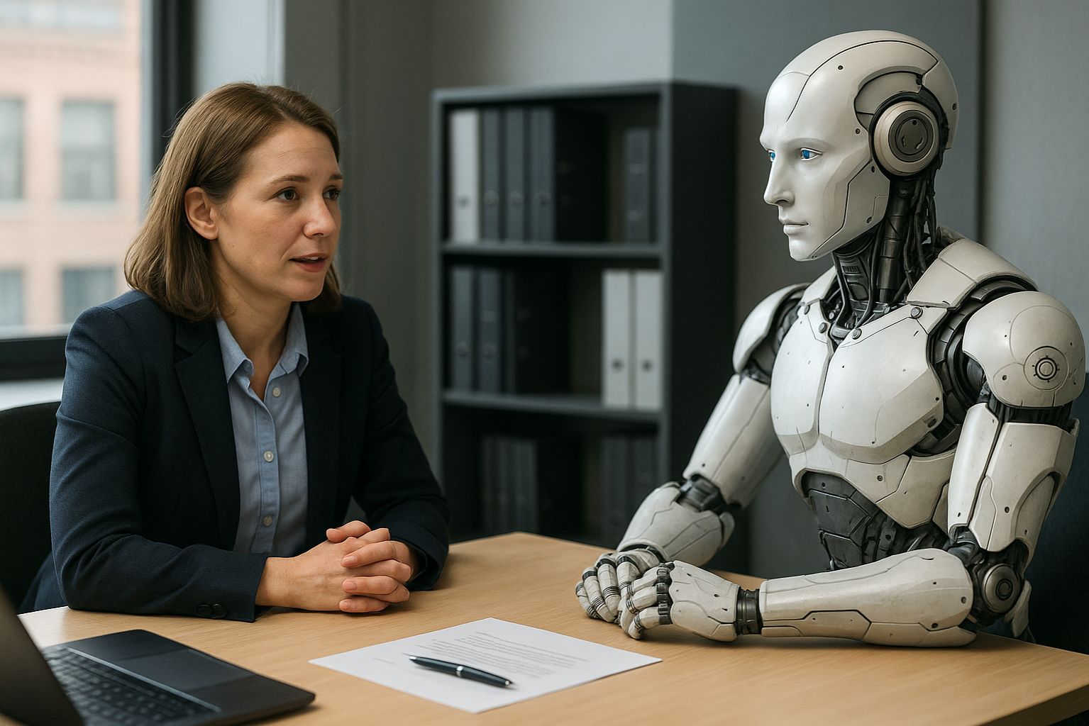 A humanoid AI system conducts a conversation with a human professional, illustrating Anthropic’s new approach to using AI for large-scale qualitative research interviews. Image Source: ChatGPT-5