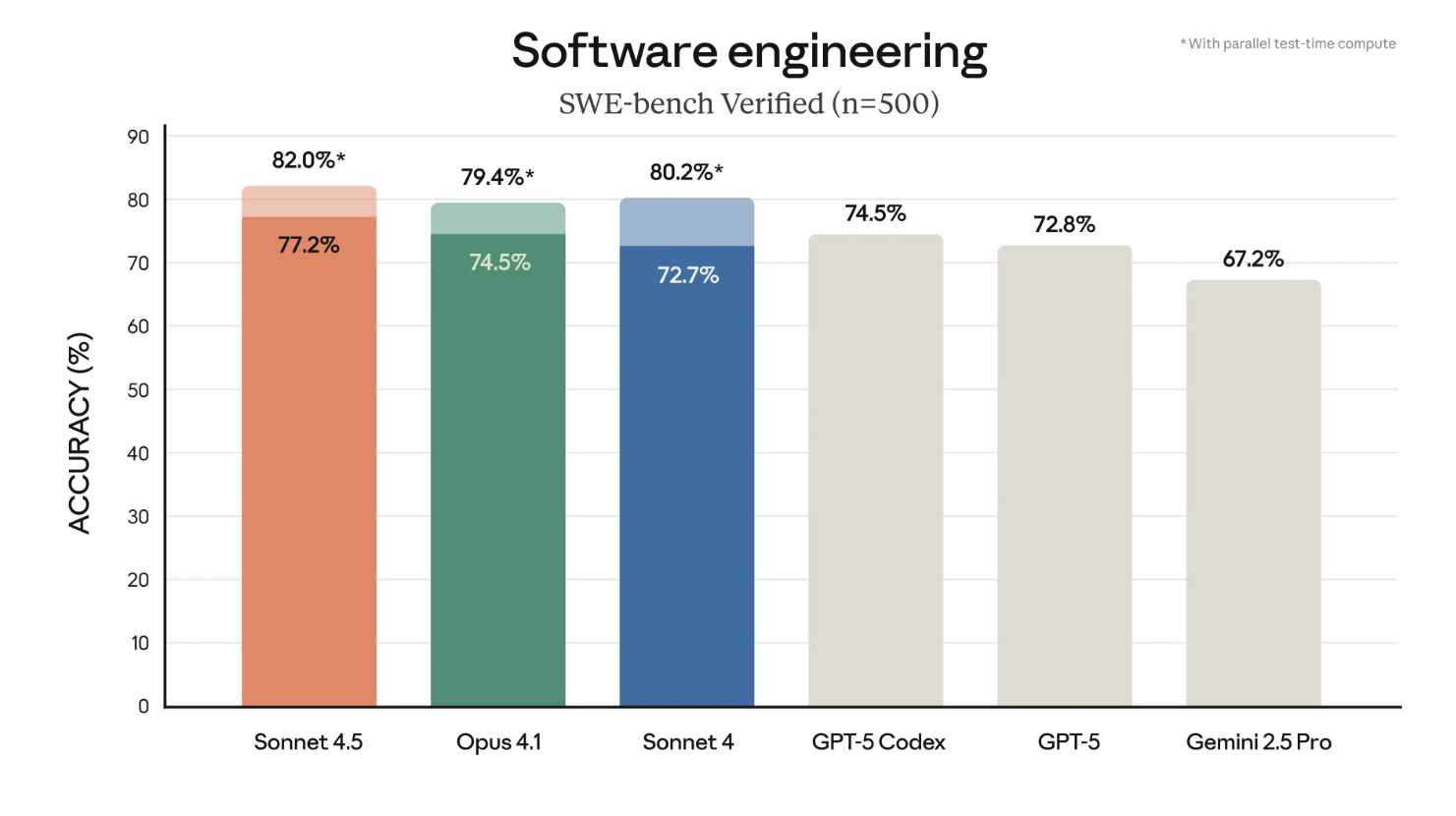 77.2% on SWE-bench Verified — and 82.0% with parallel test-time compute, the highest across major models.