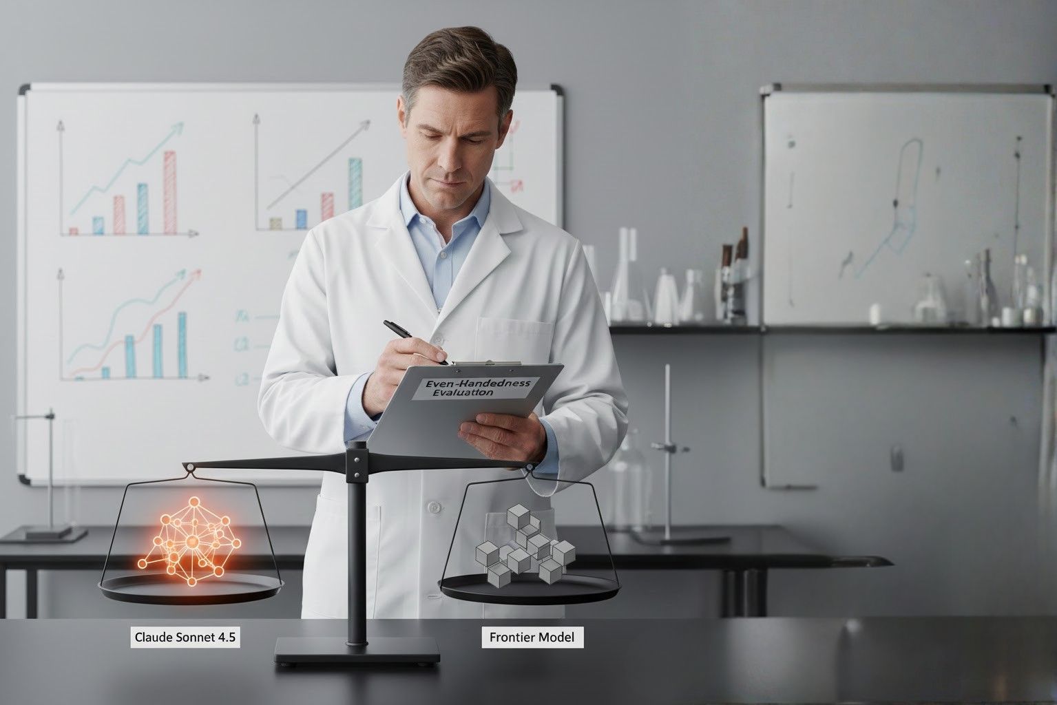 A scientist evaluates the balance, or "even-handedness," of different AI systems, comparing a model represented by an orange node cluster (Claude Sonnet 4.5) against a generalized competitor (Frontier Model) on a balanced mechanical scale. Image Source: ChatGPT-5