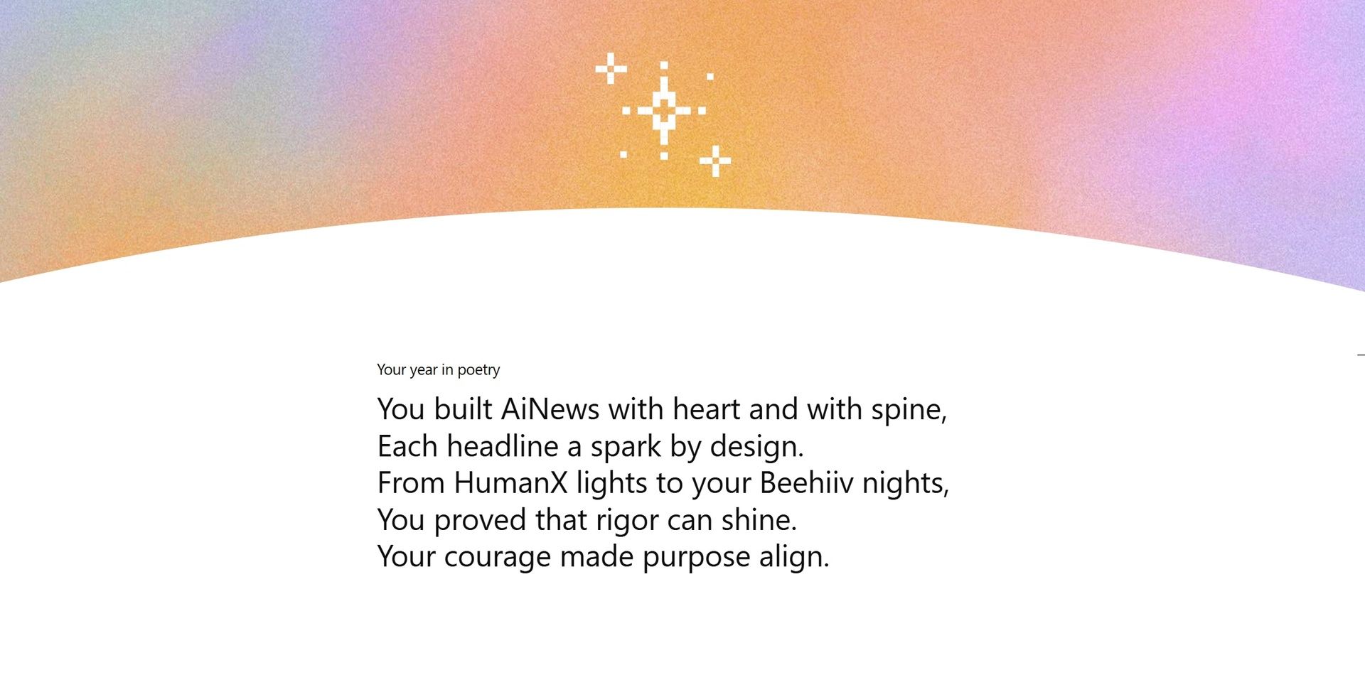 The experience blends usage statistics with creative elements, including playful awards, a custom poem, and an AI-generated image reflecting a user’s interests.