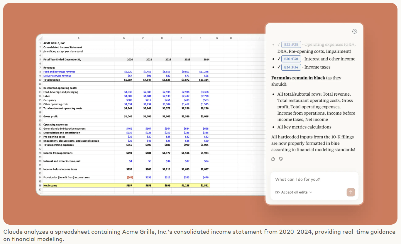 The new Excel sidebar integration allows Claude to read, analyze, modify, and create workbooks while maintaining full transparency about every change it makes. Users can review explanations, track cell references, and instantly see how formulas are adjusted.