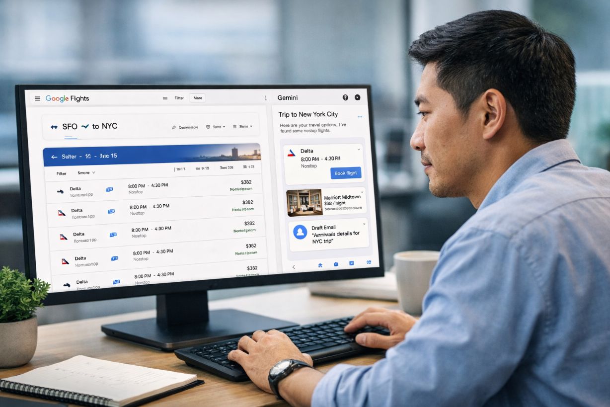 Gemini’s AI side panel in Chrome helps users plan travel, compare flights, and draft emails without leaving the browser. Image Source: ChatGPT-5.2