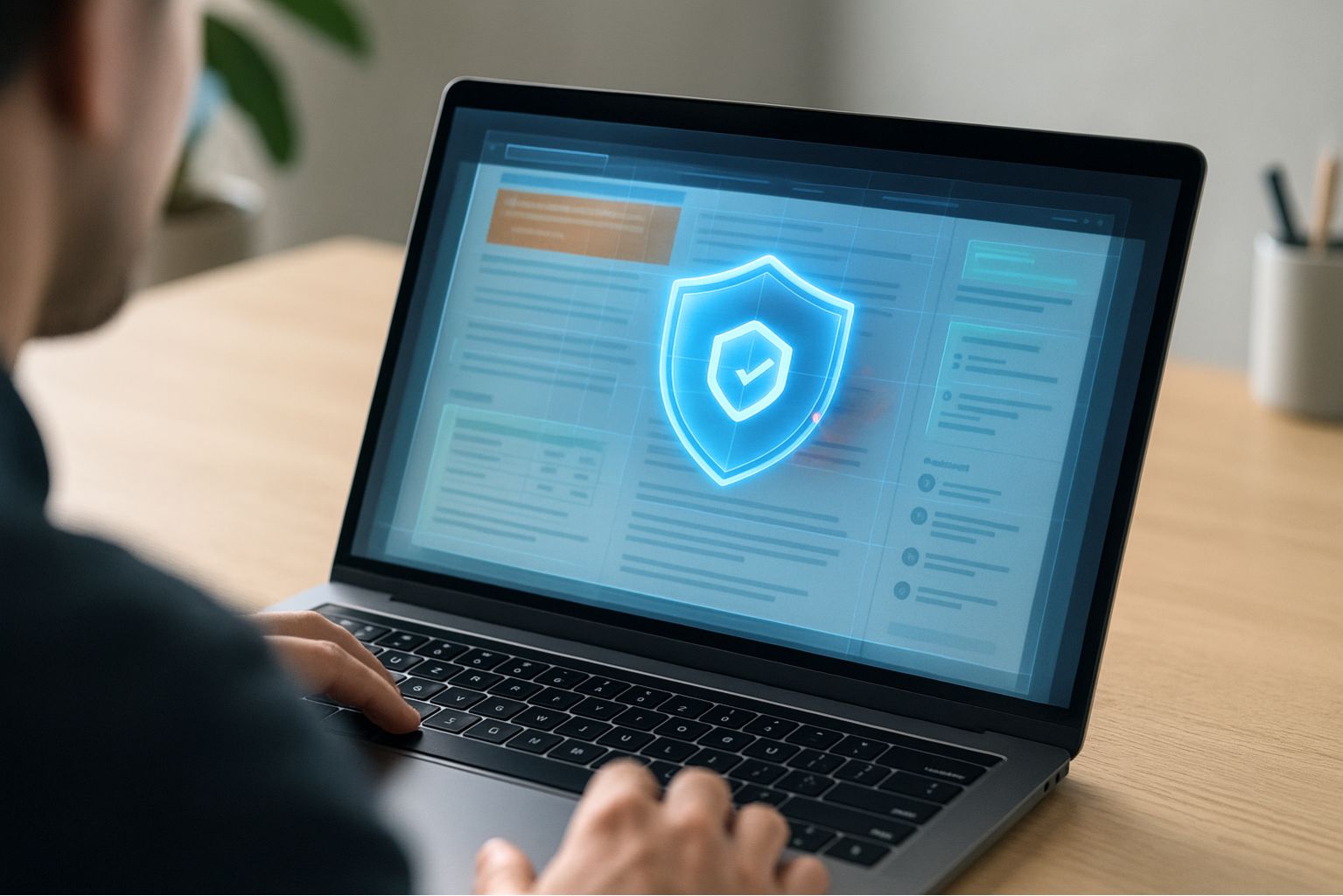 A holographic security shield overlays a real webpage as an AI browser agent scans for hidden prompt-injection attacks, reflecting the need for fast, layered defenses like Perplexity’s BrowseSafe system. Image Source: ChatGPT-5