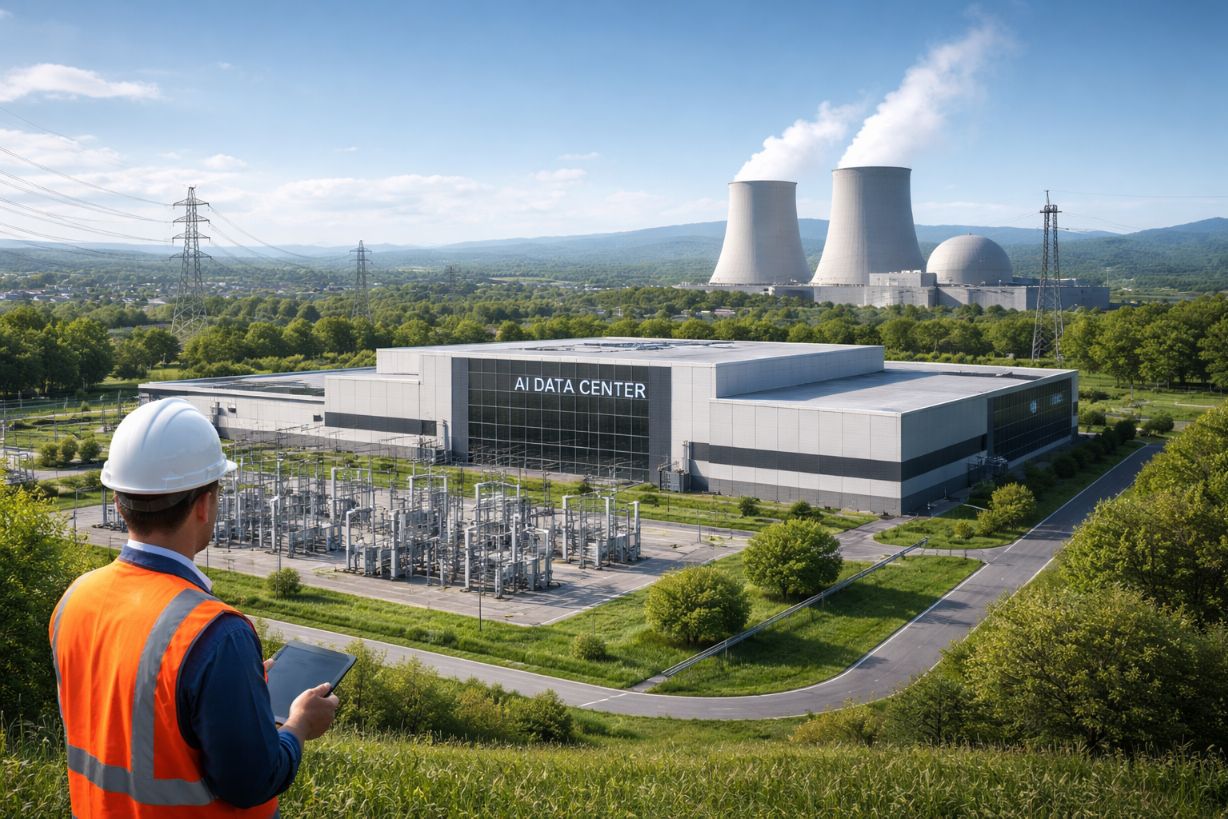 A modern AI data center connected to regional power infrastructure, with nuclear energy facilities in the background, illustrating how long-term energy planning is supporting the growing electricity demands of AI systems. Image Source: ChatGPT-5.2