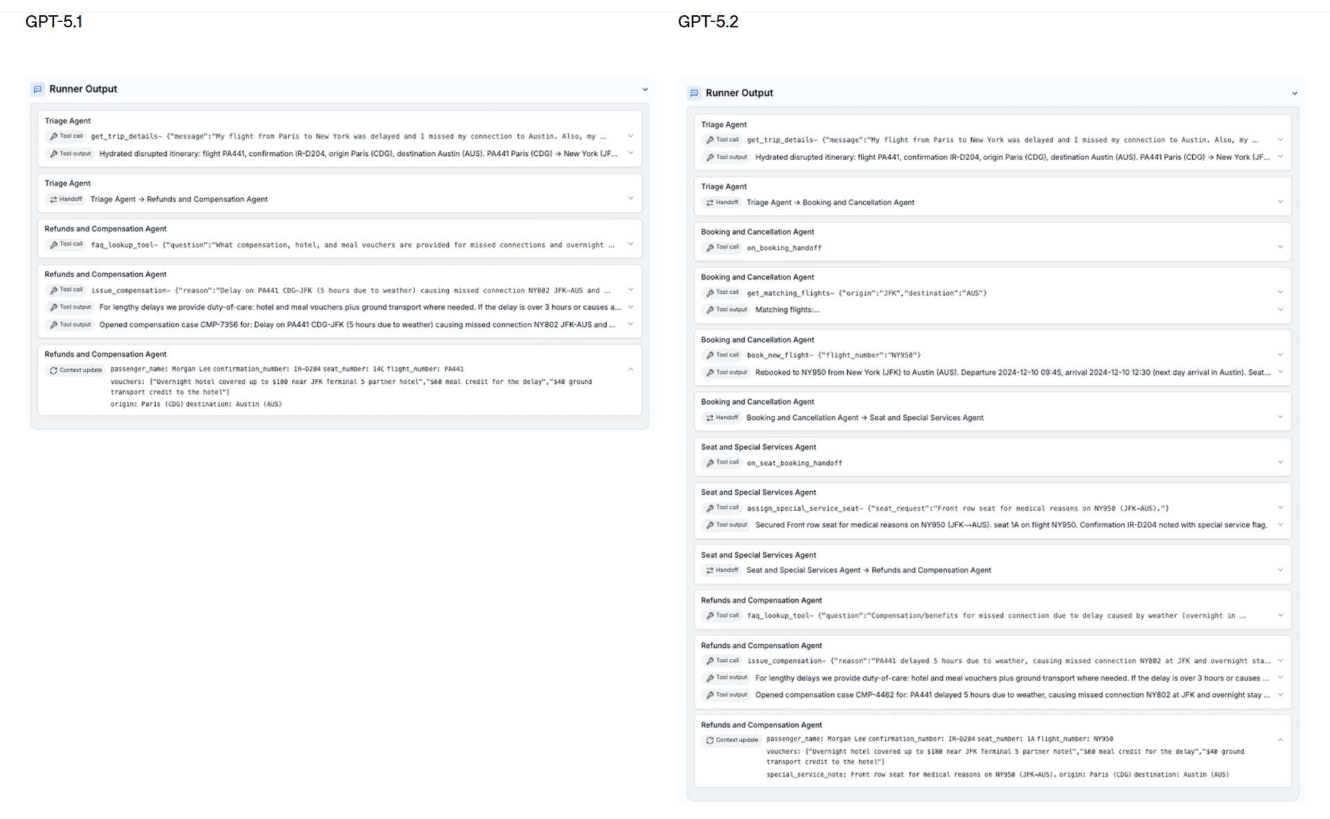 In practical examples shared by OpenAI, GPT-5.2 was better able to manage multi-step service workflows that require coordinating several agents in sequence, such as rebooking travel, arranging accommodations, and handling follow-up requirements. While errors can still occur, OpenAI says GPT-5.2 shows more consistent tool coordination than GPT-5.1 across complex, real-world scenarios.
