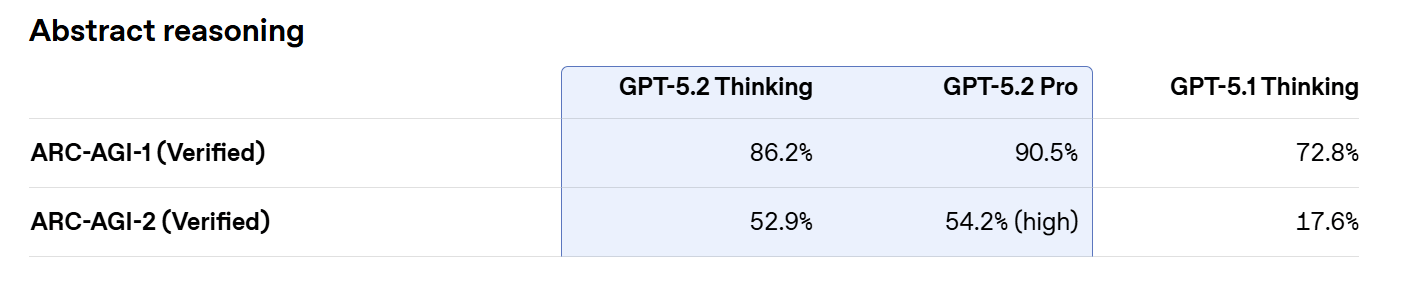 On ARC-AGI-2 (Verified), a benchmark designed to isolate abstract and fluid reasoning, GPT-5.2 Thinking scored 52.9%, while GPT-5.2 Pro reached 54.2%, setting new high marks for chain-of-thought models. On ARC-AGI-1 (Verified), GPT-5.2 Pro crossed the 90% threshold.