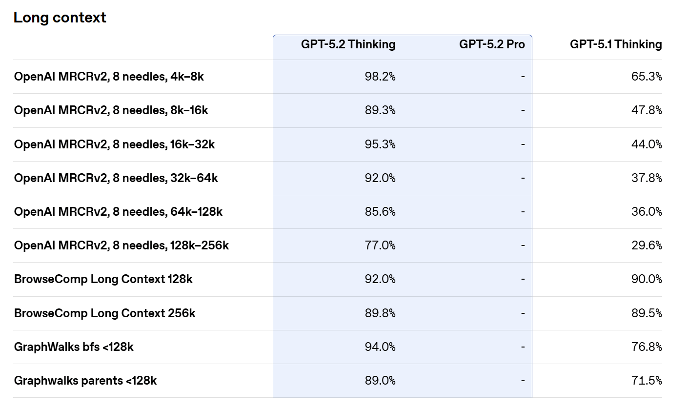 OpenAI also noted that GPT-5.2 Thinking is the first model to achieve near-perfect accuracy on the four-needle variant of MRCRv2, which evaluates a model’s ability to locate and integrate multiple pieces of information across context windows of up to 256,000 tokens.