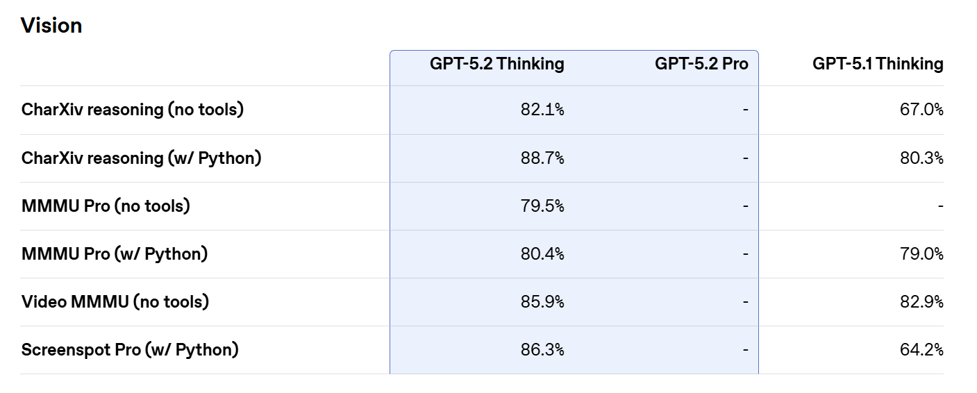 OpenAI reports that GPT-5.2 Thinking reduces error rates on chart reasoning and software interface understanding compared to earlier models, improving how the model interprets dashboards, diagrams, screenshots, and visual reports. These gains make GPT-5.2 more useful for professional workflows in finance, engineering, operations, design, and customer support, where visual information plays a central role.