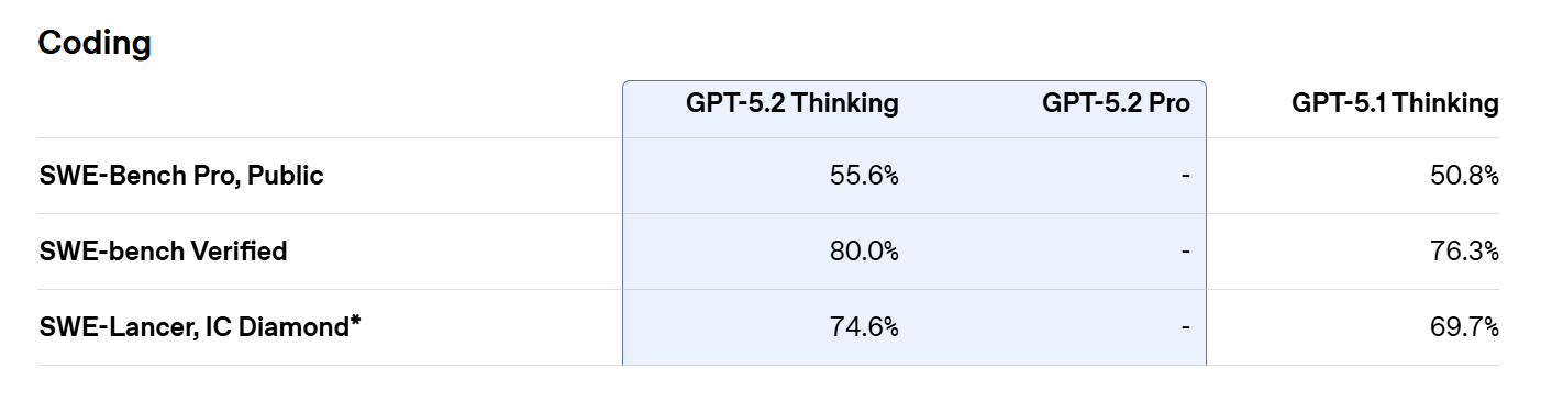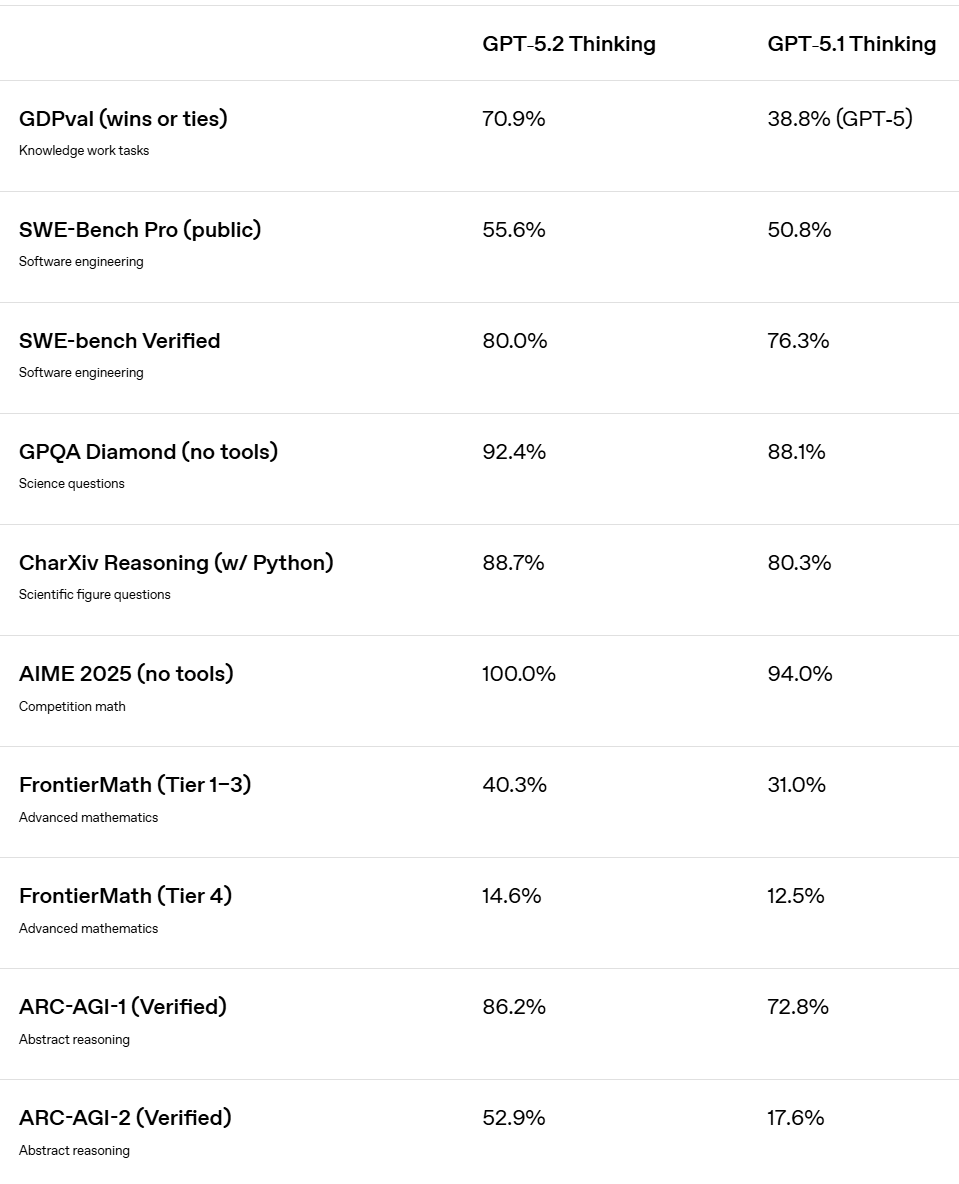 GPT-5.2 Thinking is optimized for deeper professional workflows, including coding, long-document analysis, structured reasoning, and multi-step planning.