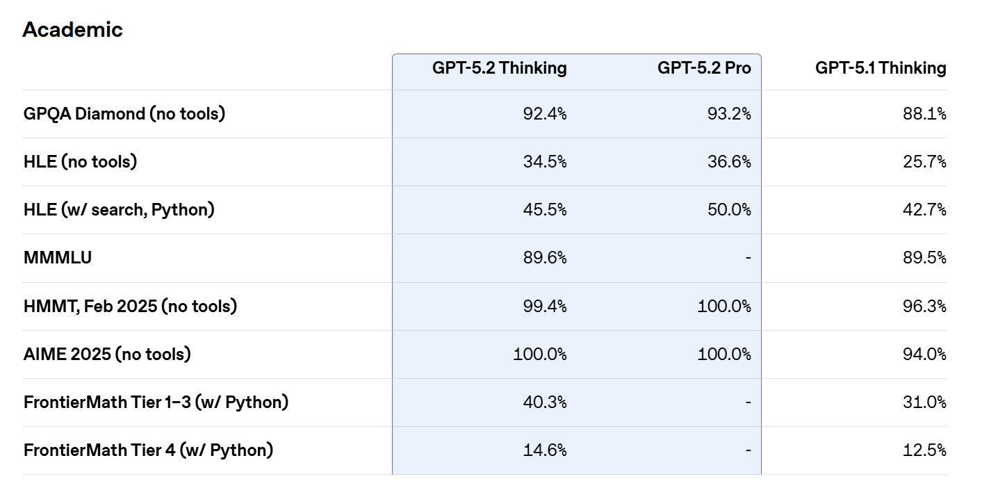 OpenAI reports that GPT-5.2 Pro and GPT-5.2 Thinking show strong performance on benchmarks designed to assess advanced scientific and mathematical reasoning. On GPQA Diamond, a graduate-level question-answering benchmark intended to resist memorization, GPT-5.2 Pro achieved a score of 93.2%, with GPT-5.2 Thinking close behind at 92.4%.