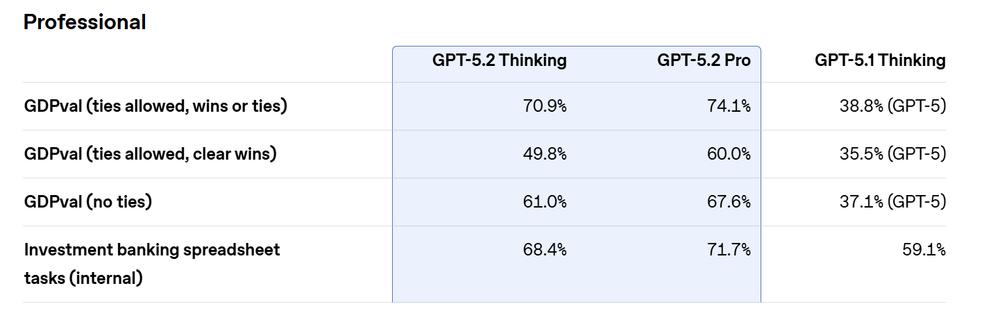 On GDPval, a benchmark measuring well-specified knowledge work tasks across 44 occupations, GPT-5.2 Thinking achieved a new state-of-the-art score. According to expert human judges, the model beat or tied top industry professionals on 70.9% of comparisons. These tasks included producing spreadsheets, presentations, and other business artifacts.