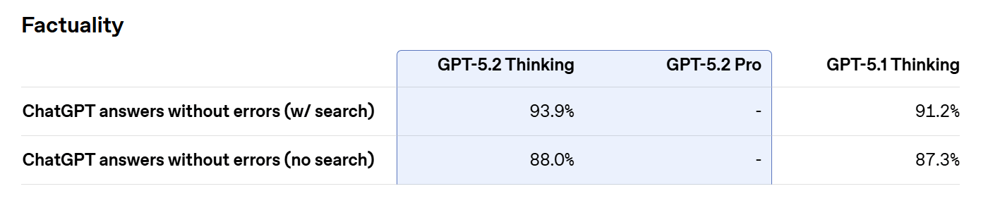 On a set of de-identified ChatGPT queries, GPT-5.2 Thinking produced responses with errors 30% relatively less often than GPT-5.1 Thinking, according to OpenAI. This reduction in hallucinations improves the model’s reliability for tasks such as research, writing, analysis, and decision support—areas where accuracy matters for everyday professional work. OpenAI cautioned that, like all models, GPT-5.2 is not error-free and that critical outputs should still be reviewed and verified by users.