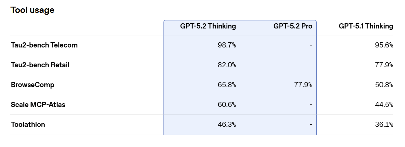 On Tau2-bench Telecom, an evaluation that measures a model’s ability to use tools reliably across extended, multi-turn interactions, GPT-5.2 Thinking achieved another state-of-the-art score of 98.7%, setting a new OpenAI benchmark. This result indicates stronger consistency when coordinating tools over longer workflows compared to earlier models.