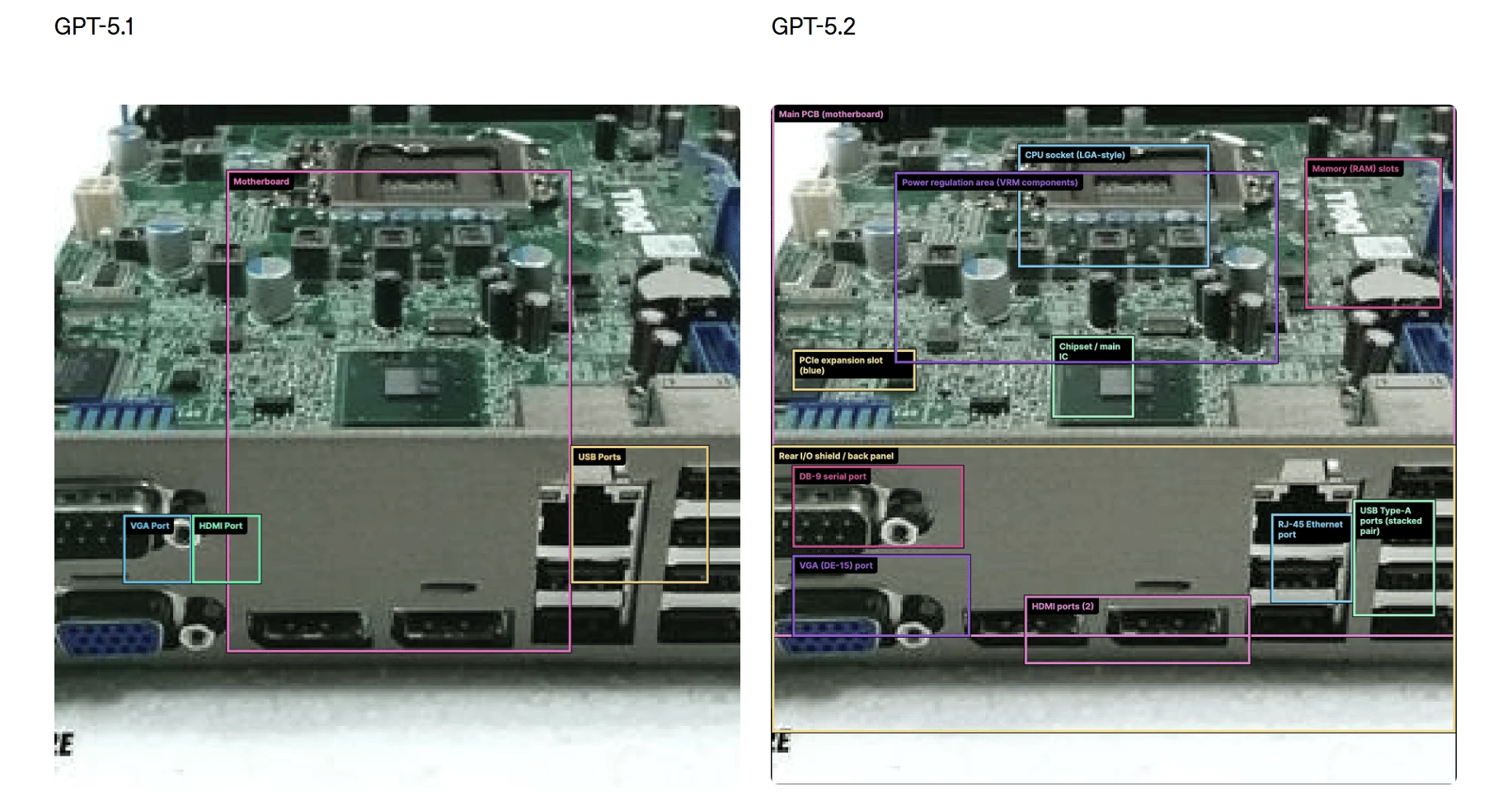 According to OpenAI, GPT-5.2 also demonstrates a stronger understanding of spatial relationships within images. This includes improved ability to recognize how elements are positioned relative to one another—an important capability for tasks such as analyzing technical diagrams or interpreting complex interfaces. In internal examples shared by OpenAI, GPT-5.2 was better able to identify and label components within low-quality images, while earlier models captured fewer elements and showed weaker spatial awareness. OpenAI noted that while errors still occur, GPT-5.2 shows more consistent visual comprehension than GPT-5.1.