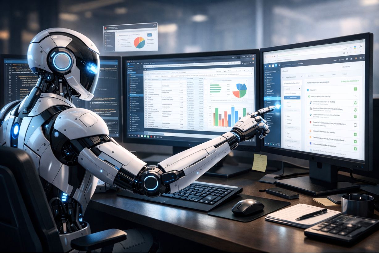 An AI agent interacts with spreadsheets, software tools, and code across multiple screens—illustrating the workplace automation capabilities OpenAI describes in GPT-5.4. Image Source: ChatGPT - 5.2