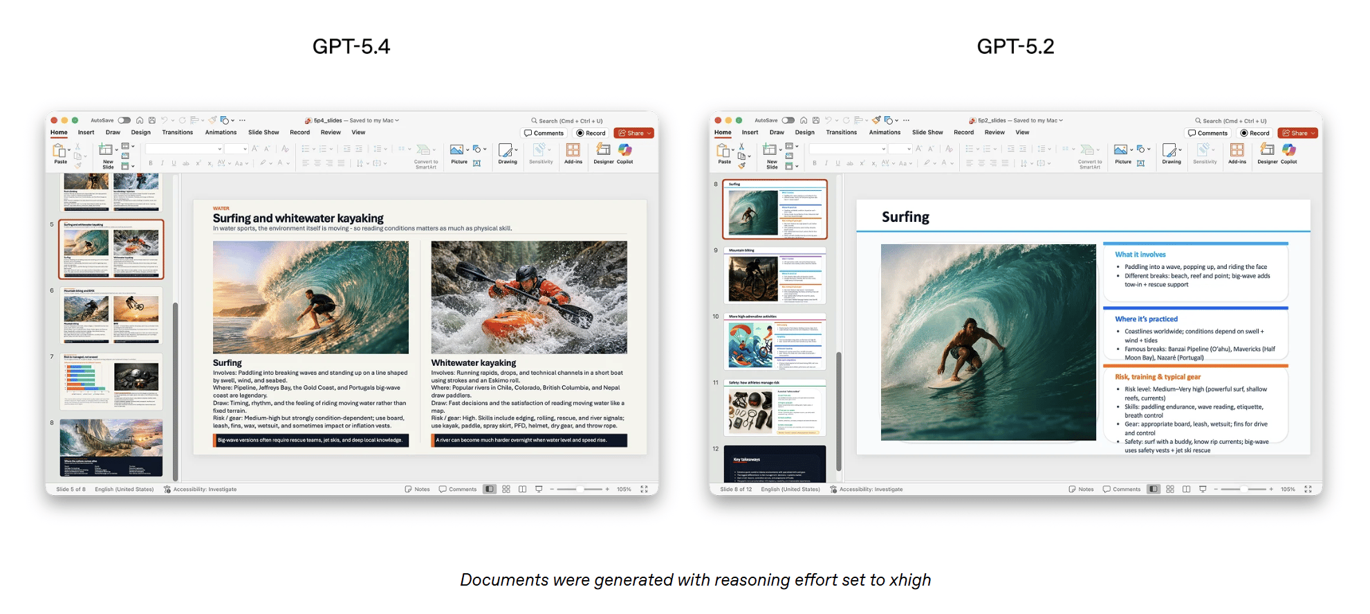 In a separate set of presentation evaluation prompts, human reviewers preferred presentations generated by GPT-5.4 68% of the time over those produced by GPT-5.2, citing stronger visual design, greater visual variety, and more effective use of generated images.