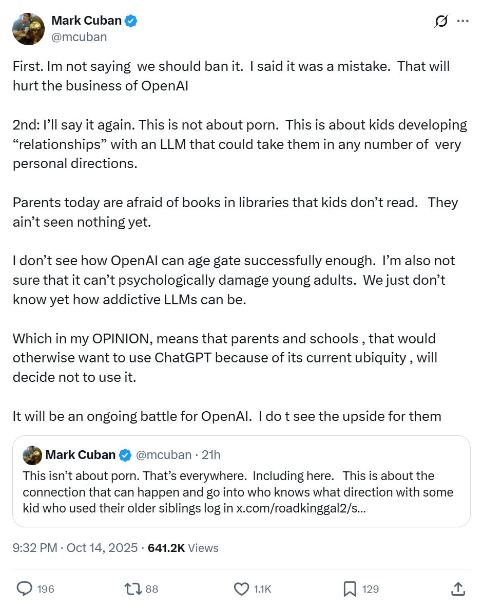 Cuban questioned whether OpenAI’s safeguards are foolproof, arguing that tech-savvy minors will find workarounds. He went further in that same post on X, writing: