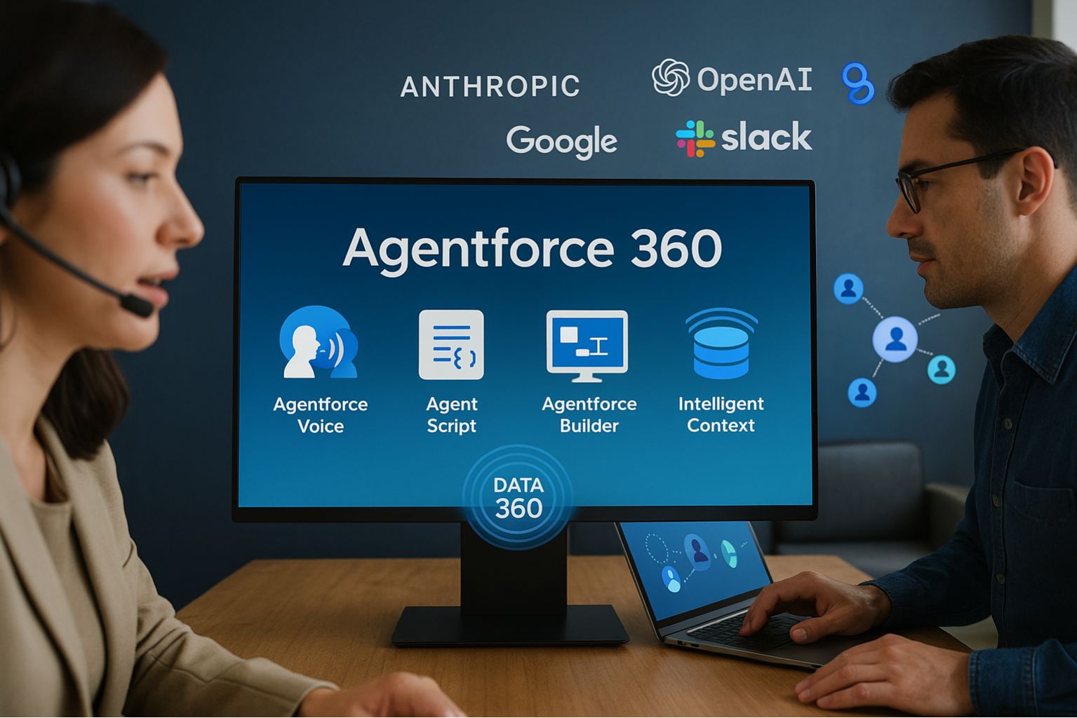 Salesforce’s Agentforce 360 connects Builder, Script, Voice, Intelligent Context, and Data 360, integrating with Slack and leading AI partners for enterprise collaboration. Image Source: ChatGPT-5